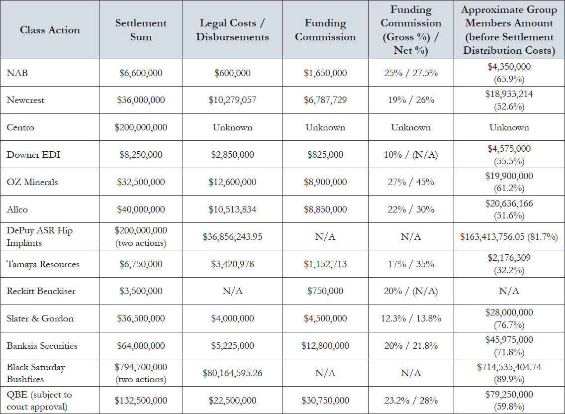 We have analyzed the settlement of recent Australian class actions (and in particular, the distribution of amounts for legal costs, funding commissions and group members), which we set out in the following table: