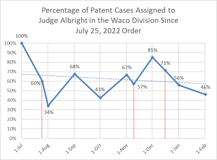 On November 9, 2022, then Chief Judge Garcia issued a subsequent order days before stepping down from his role as Chief Judge and taking senior status. The new order stated that Judge Albright would be assigned “[a]ll cases and proceedings in the Waco Division.” See Amended Order Assigning the Business of the Court (Garcia, C.J.) (W.D. Tex. Nov. 9, 2022) (emphasis added). After the November Order issued, the percentage of new patent cases in the Waco Division assigned to Judge Albright temporarily increased—reaching a high of almost 80% in December 2022. Plaintiffs’ attorneys, however, appear to have remained skeptical of the November Order because the new language conflicted with the earlier July Order and because the limited data had not yet substantiated whether the spike in patent case assignments to Judge Albright in December was due to the November Order.