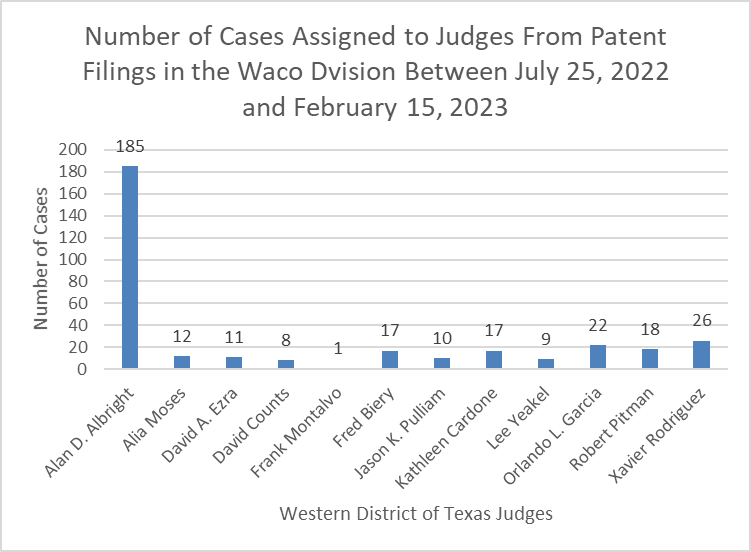 On July 25, 2022, then Western District of Texas Chief Judge Orlando Garcia issued an order declaring that new patent cases filed in the Waco Division would be randomly assigned among 12 judges in the Western District of Texas. See Order Assigning the Business of the Court as it Relates to Patent Cases (Garcia, C.J.) (W.D. Tex. July 25, 2022). Initially, litigants expected that this would drastically reduce the number of filings in the Waco Division as plaintiffs would have only an expected 8% chance of their cases being randomly assigned to Judge Albright—a significant change from the certainty that previously came from filing patent cases in the single-judge division. But statistics show that turned out not to be the case. Over the next three months, of the 210 patent cases filed in the Waco Division, 50% were assigned to Judge Albright.
